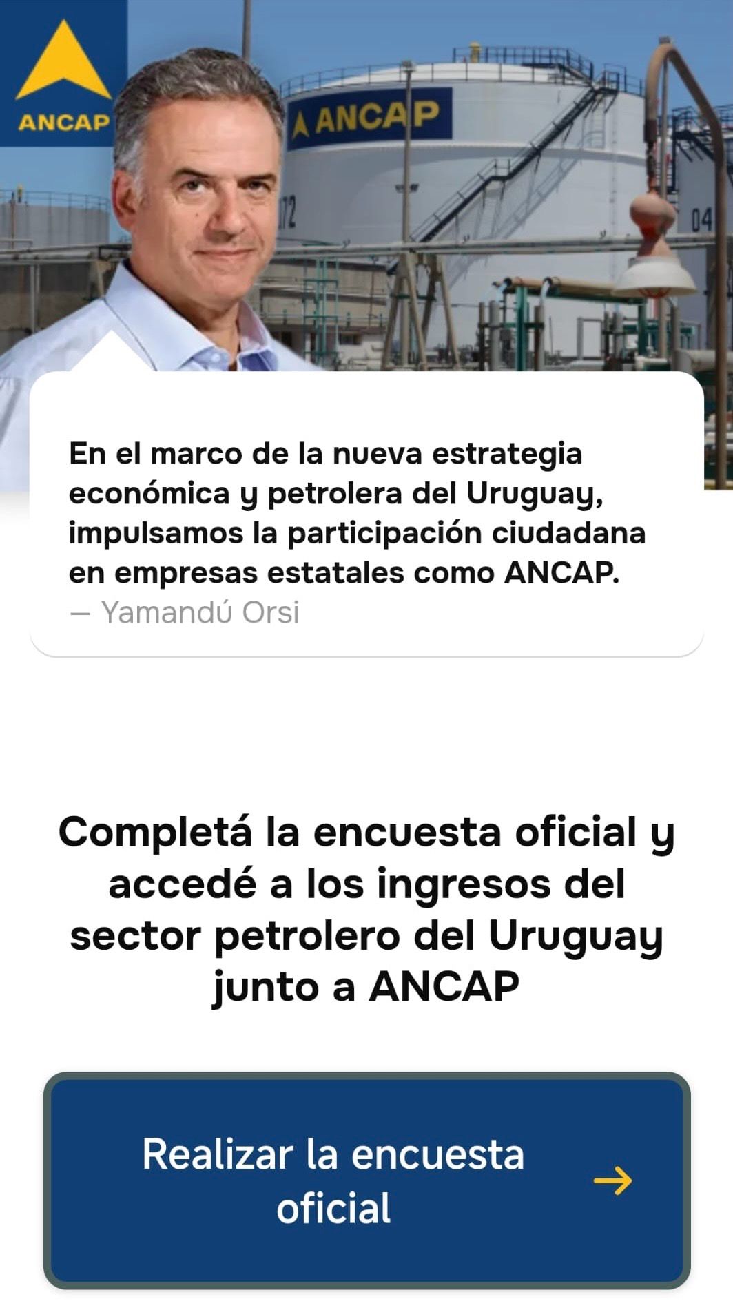 ANCAP informa a la ciudadanía que en los últimos días circula en redes sociales una encuesta falsa que se presenta como oficial y utiliza de forma indebida el nombre y la imagen de ANCAP, así como la del Presidente de la República, Yamandú Orsi.