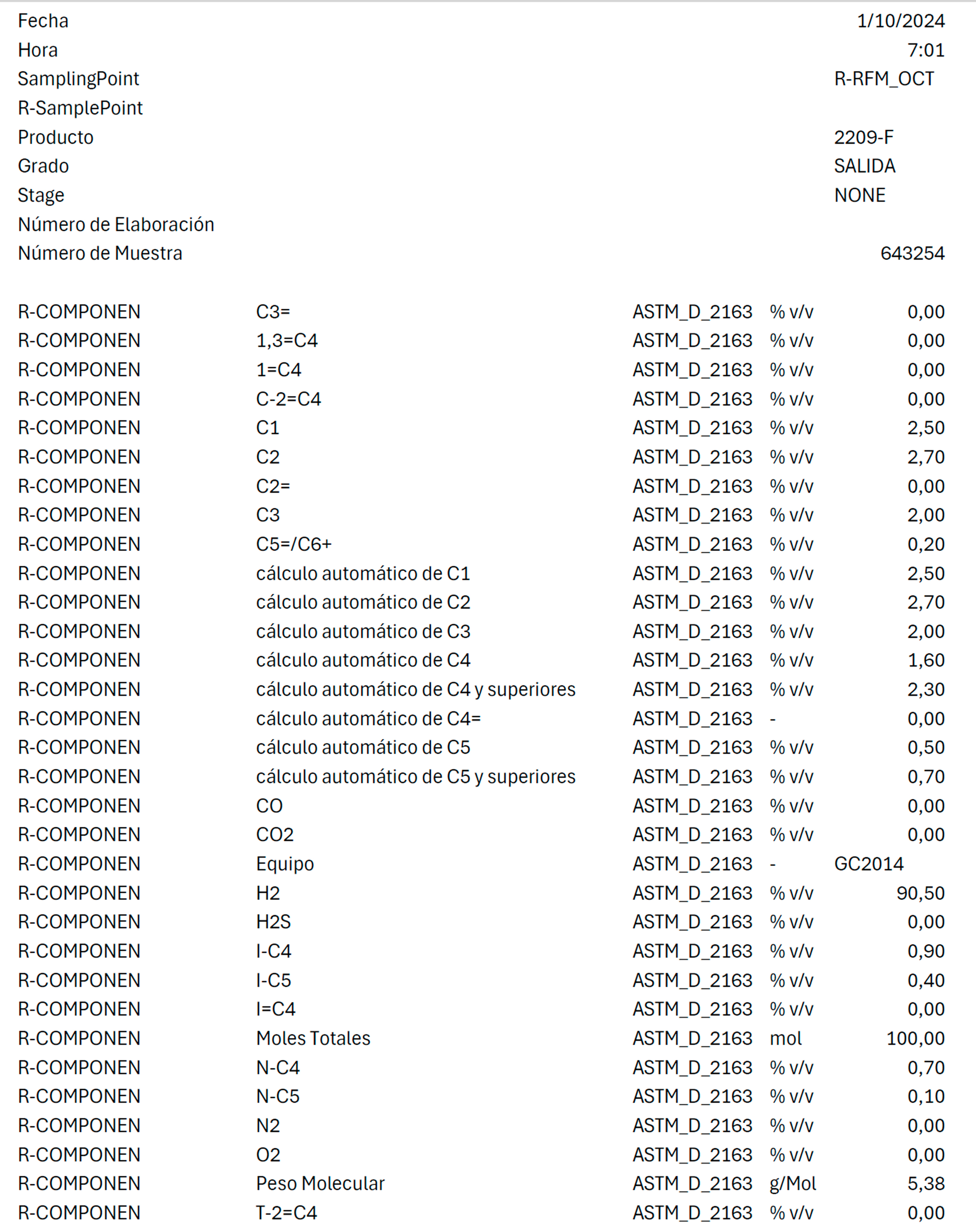La información del gas que sale del receptor 2209-F que se destina al sistema de FG se presentará de la siguiente manera para cada día que haya análisis: