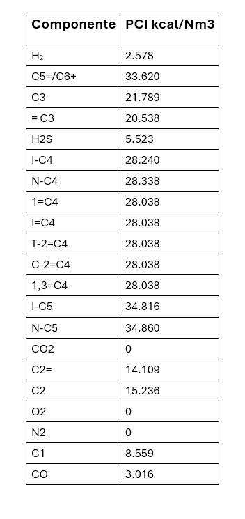 Para los casos presentados de FCC y CCR, el PCI de los respectivos gases se calcula a partir de la cantidad de cada componente (fracción de H2, C1, C2, C3, etc) en cada gas y su respectivo PCI individual, es decir: